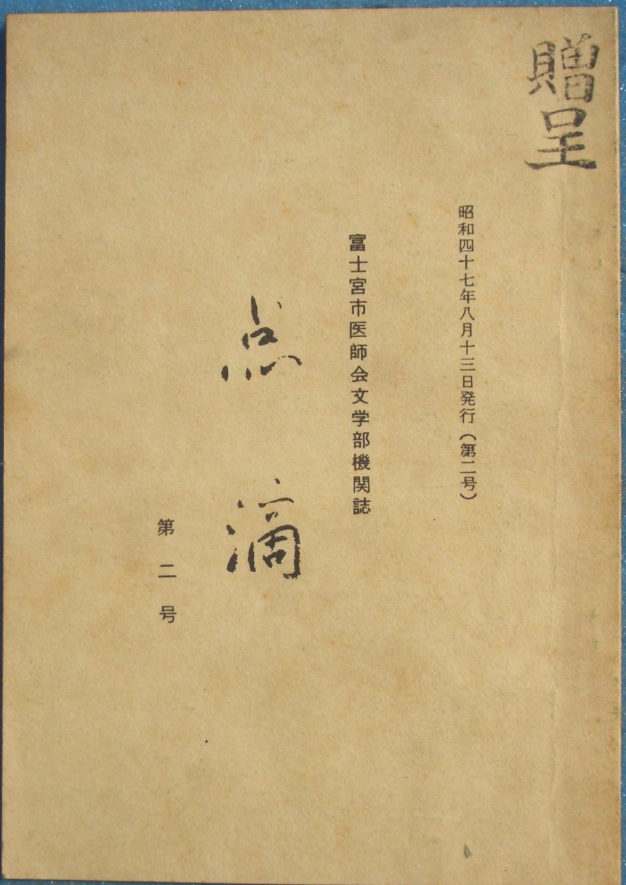 | 点滴 2号・昭和47年8月13日号 富士宮市医師会文学部機関紙 | A5判、20ページ、贈呈印 | 富士宮市医師会文学部 | 昭和47年 | \500 | |
