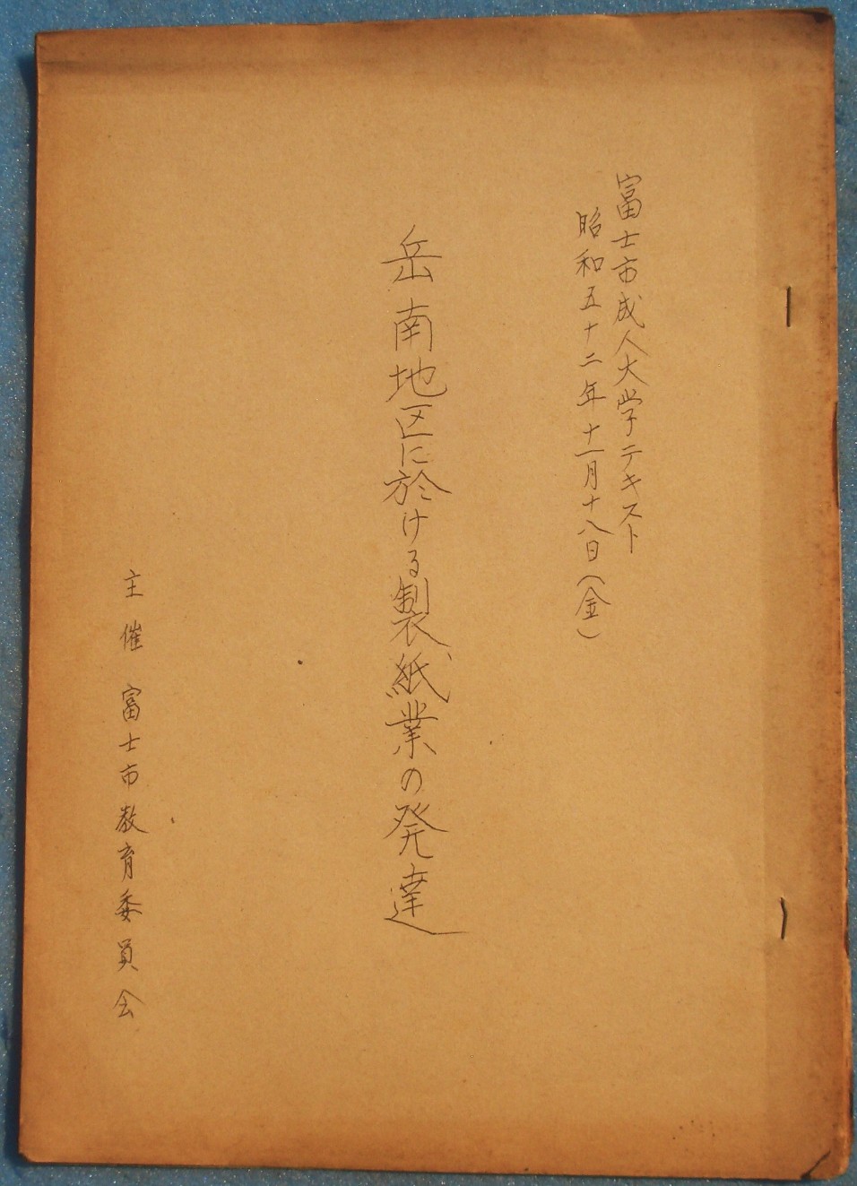 | 岳南地区に於ける製紙業の発達 富士市成人大学テキスト | B5判、孔版10ページ、ホッチキス止、ヤケ | 富士市教育委員会主催 | 昭和52年 | \600 | |