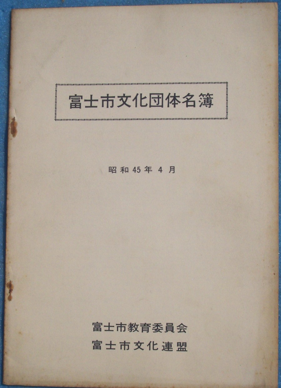 | 富士市文化団体名簿 昭和45年4月 富士市教育委員会・富士市文化連盟 | B5判、24ページ、表紙端汚 | 富士市教育委員会・富士市文化連盟 | 昭和45年 | \600 | |