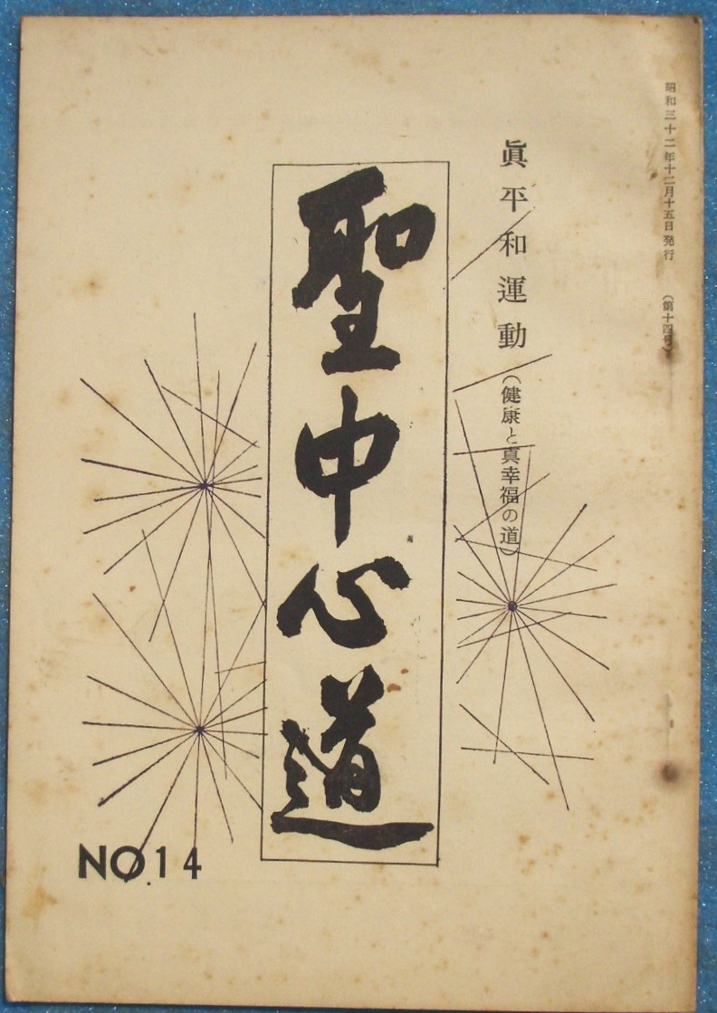 | 聖中心道 14号 昭和32年12月 真平和運動(健康と真幸福の道) 聖中心社・肥田通夫(静岡県伊東市) | B6判、32ページ、ヤケ汚 | 聖中心社・肥田通夫(静岡県伊東市) | 昭和32年 | \500 | |