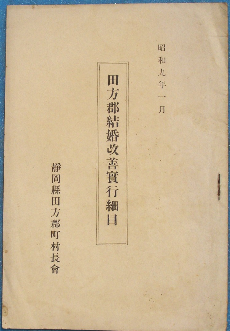 | 田方郡結婚改善実行細目 昭和9年1月 静岡県田方郡町村長会 | B6判、14ページ、小冊子、端痛、少汚 | 静岡県田方郡町村長会 | 昭和9年 | \1,000 | |