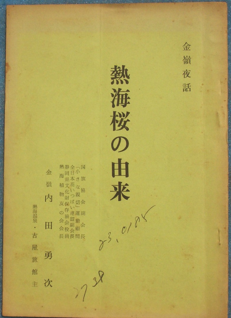| 熱海桜の由来 金嶺夜話 熱海温泉古屋旅館主・内田勇次 小冊子 | B6判、12ページ、小冊子、表紙少書、折跡、ヤケ汚 | 熱海温泉古屋旅館主・金嶺内田勇次 | 昭和52年 | \400 | |