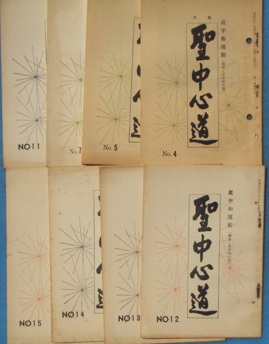 | 聖中心道 眞平和運動(健康と真幸福の道) 4〜15号の内八冊 | B6判、4・5・7・11〜15号の8冊、パンチ穴、小口ヤケ | 肥田通夫編刊 | 静岡県伊東市・聖中心社 | 昭和31〜33年 | 売切 |