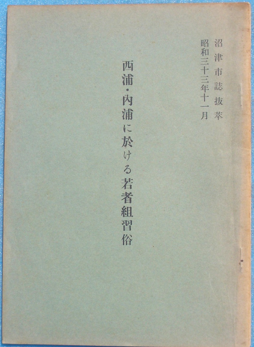 | 西浦・内浦に於ける若者組習俗 沼津市誌抜萃 | A5判、60ページ、背・小口ヤケ | 沼津市誌抜萃 | 昭和33年11月 | \600 | |