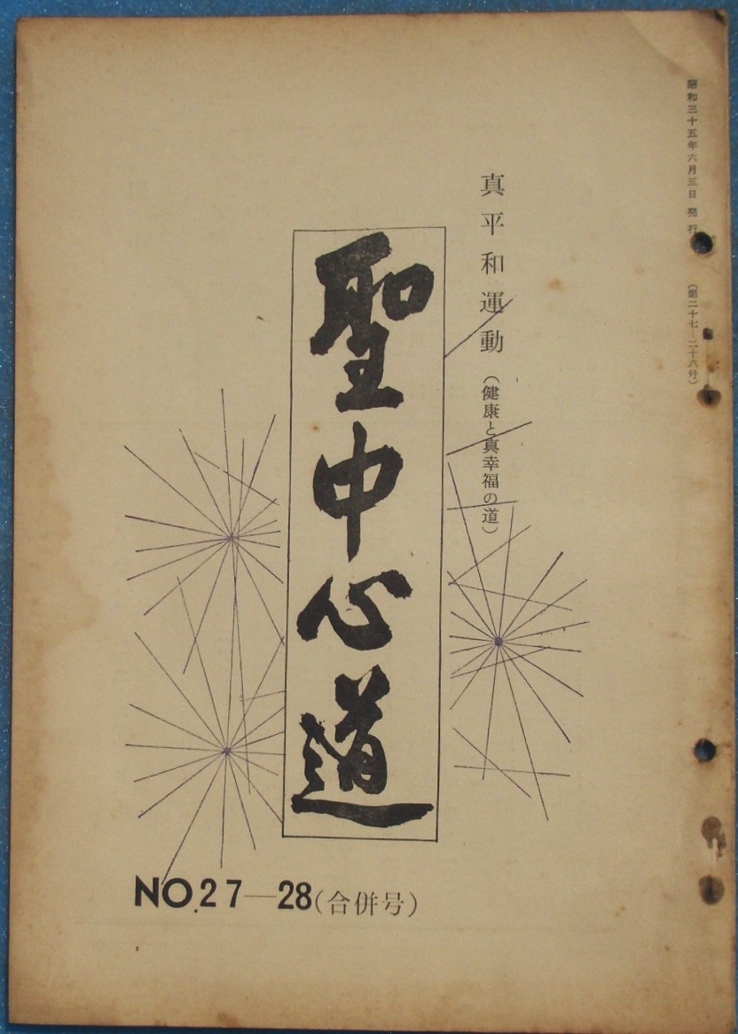 | 聖中心道 真平和運動(健康と真幸福の道) 27・28合併号 (昭和35年6月) 肥田通夫編集発行 聖中心社 | A5判、42ページ、パンチ穴、朱線、表裏表紙ヤケ汚少シミ | 聖中心社(静岡県伊東市) | 昭和35年 | 売切 | |
