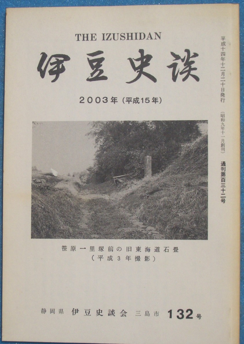 | 伊豆史談 132号 2003年(平成15年) 伊豆史談会 | A5判、76ページ、背少ヤケ | 伊豆における「西郷頼母、旧東海道一里塚と三島宿の里程について、駿豆国境に関する考察ほか | 伊豆史談会 | 平成15年 | \500 |