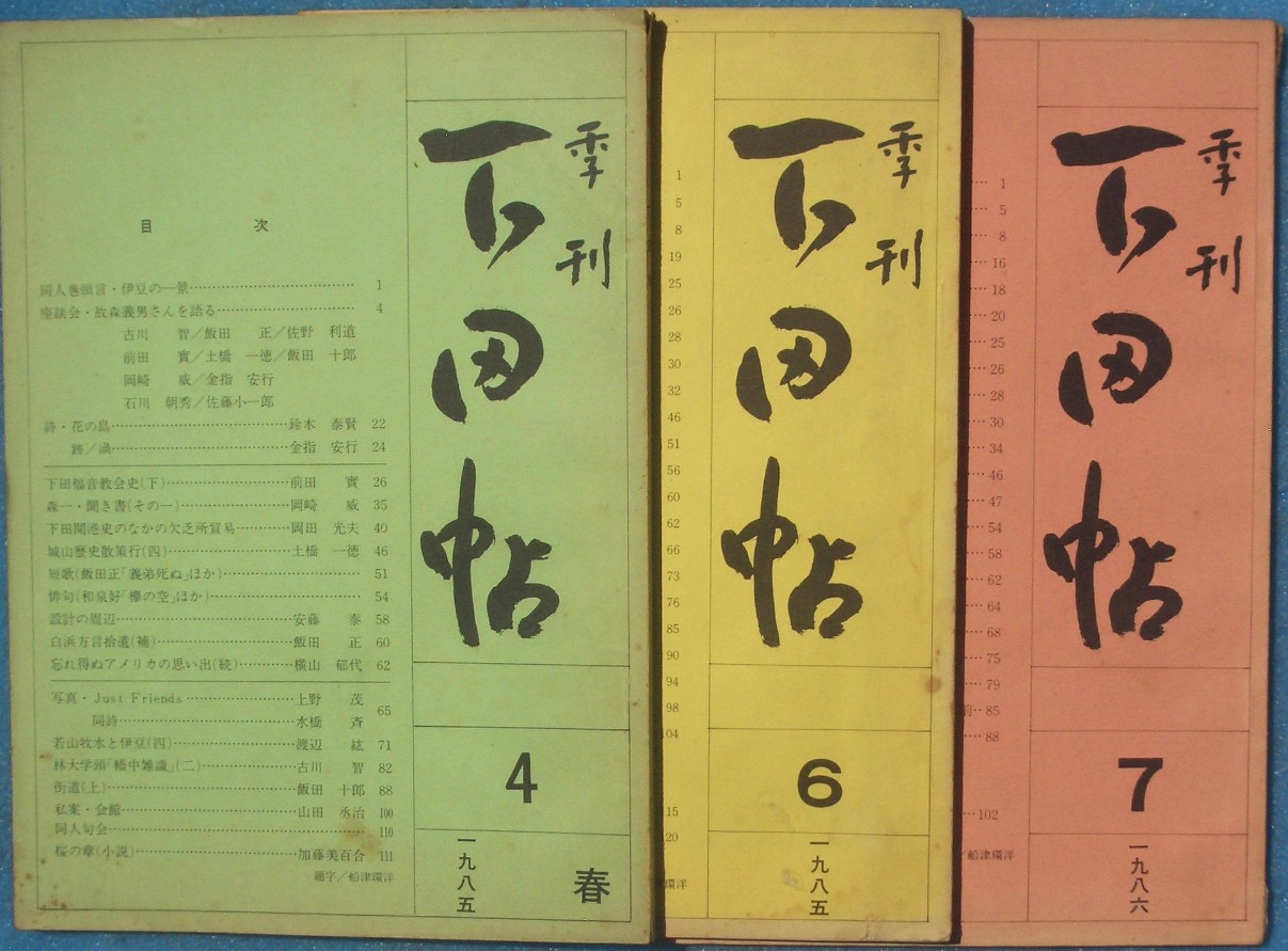| 季刊下田帖 4・6・7号 三冊 (静岡県) 下田帖編集発行所 | A5判、背・小口ヤケ、少汚 | 下田帖編集発行所 | 1985・1986年 | \1,500 | |