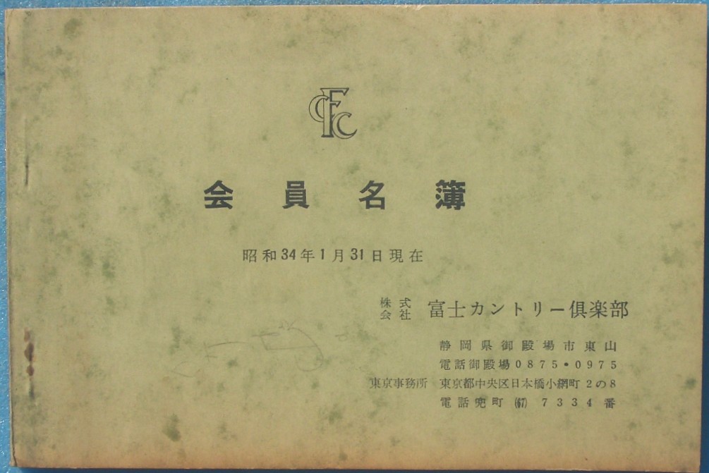 | 会員名簿 昭和34年1月31日現在 静岡県御殿場市・富士カントリー倶楽部 | 文庫判サイズ、横本、116ページ、表裏表紙汚、小口ヤケ | 静岡県御殿場市・富士カントリー倶楽部 | 昭和34年 | \1,500 | |