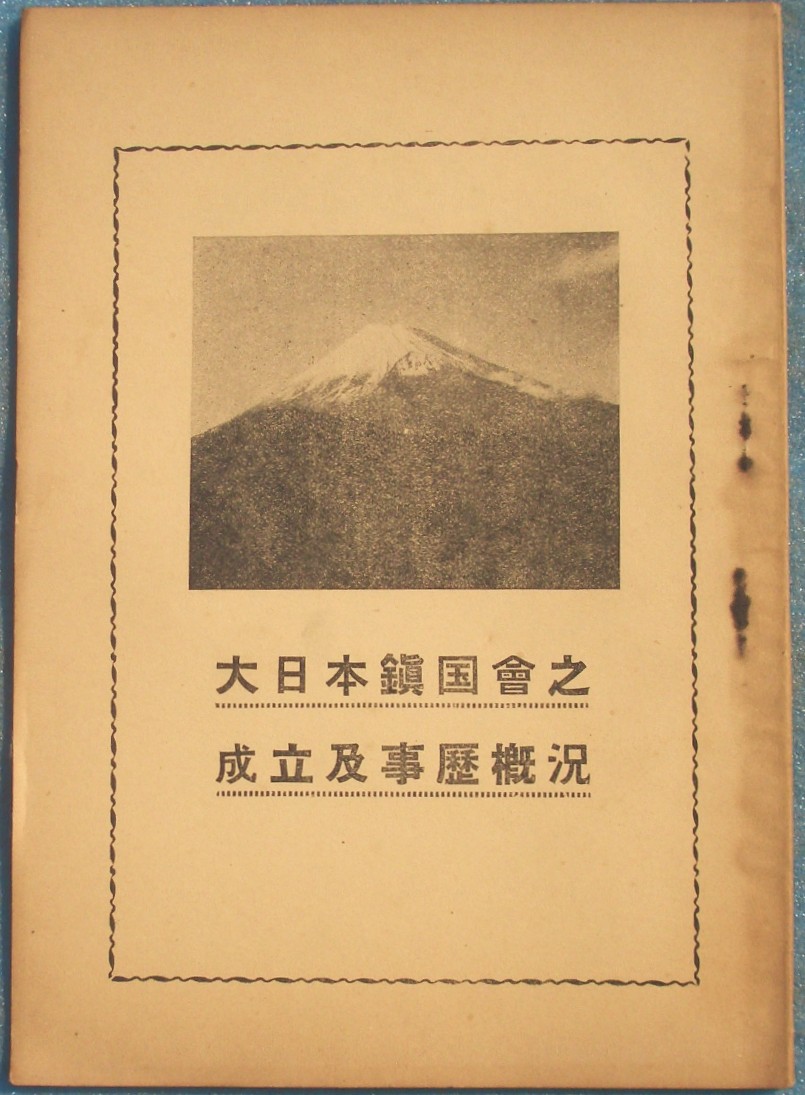 | 大日本鎮国会之成立及事歴概況 稲葉真風 (静岡県富士市) | B6判、24ページ、ヤケ、釘錆 | 大日本鎮国会・稲葉真風 | 昭和27年序 | \500 | |