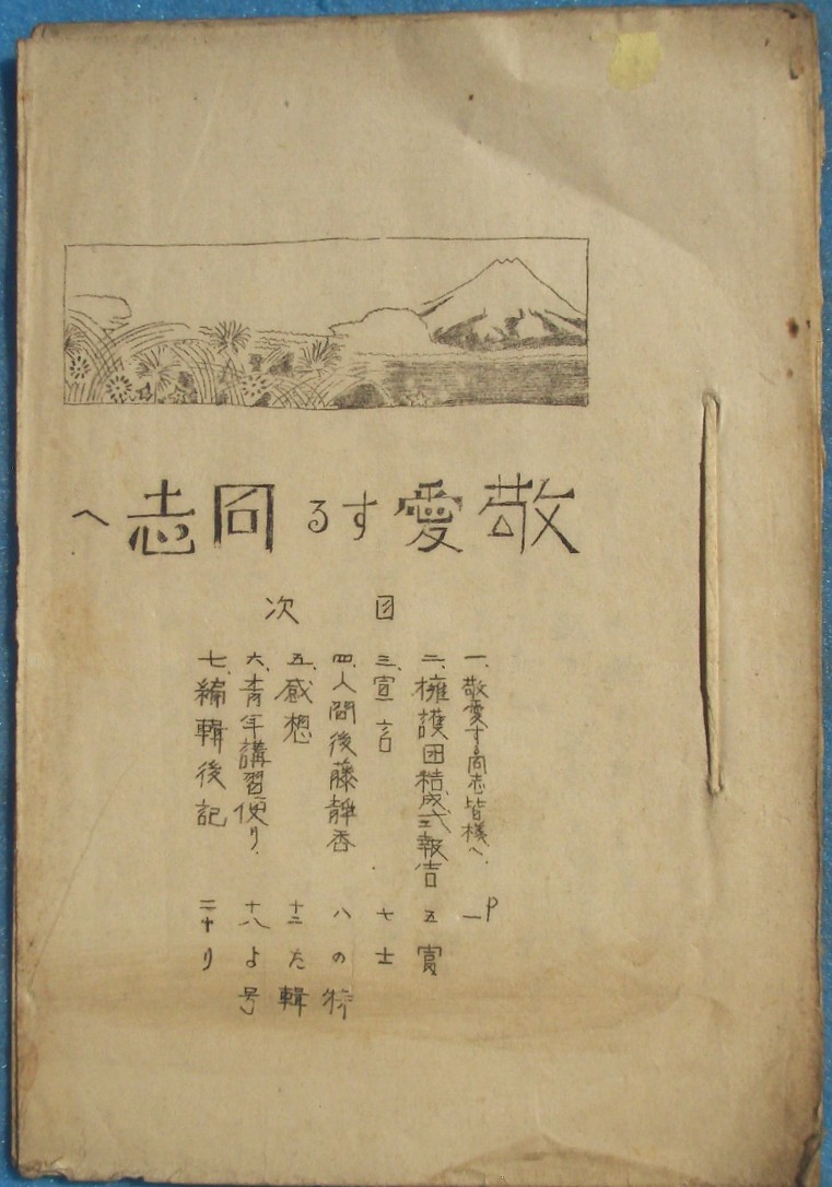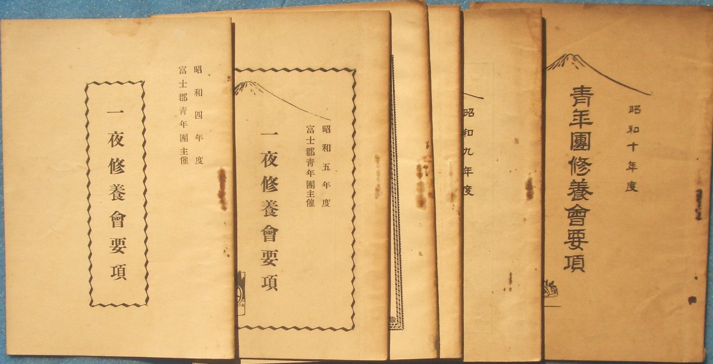 | 一夜修養会要項・青年団修養会要項 昭和4〜10年度 七冊 富士郡青年団 (静岡県) | B6判、各冊薄冊、ヤケ、錆、汚、記名 | 富士郡青年団 | 昭和4〜10年度 | \5,000 | |