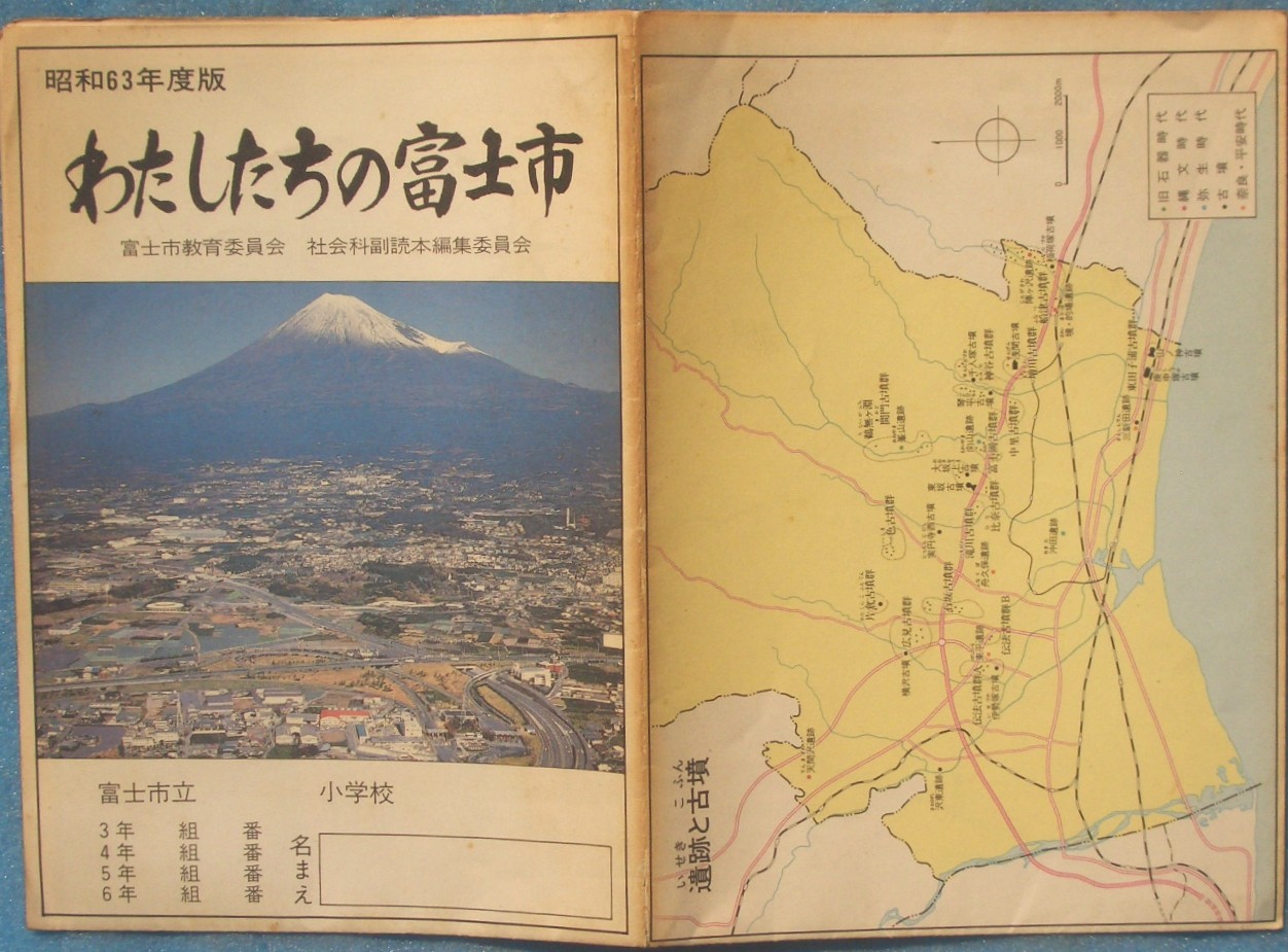 | わたしたちの富士市 昭和63年度版 一枚 小学校用 | 59×42センチ、端ヤケ汚 | 富士市教育委員会 社会科副読本編集委員会 | 昭和63年 | \1,000 | |