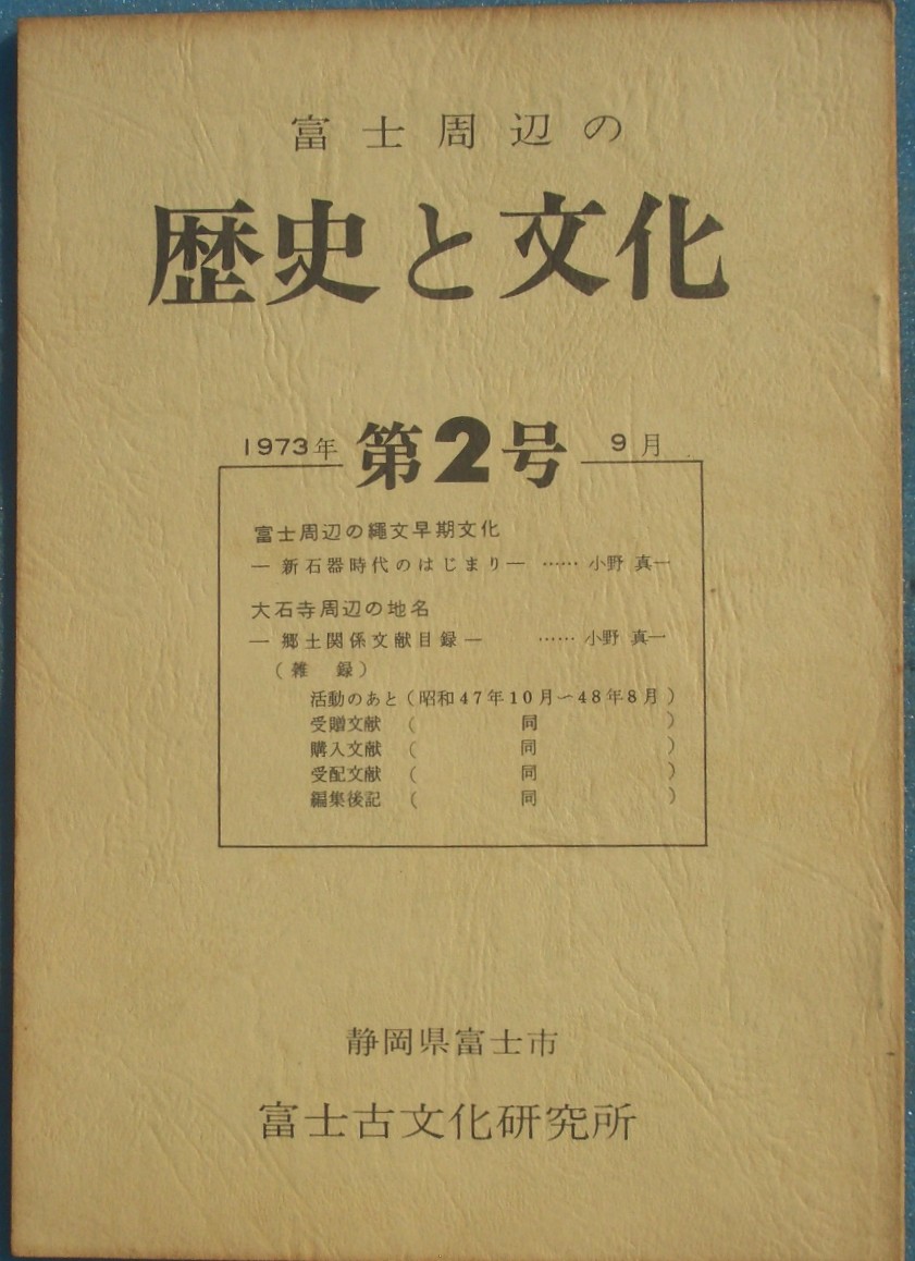 | 富士周辺の歴史と文化 2号(1973年9月) 静岡県富士市・富士古文化研究所 | A5判、50ページ、背・小口ヤケ | 富士周辺の縄文早期文化、大石寺周辺の地名 郷土関係文献目録 ほか | 静岡県富士市・富士古文化研究所 | 昭和48年 | \600 |