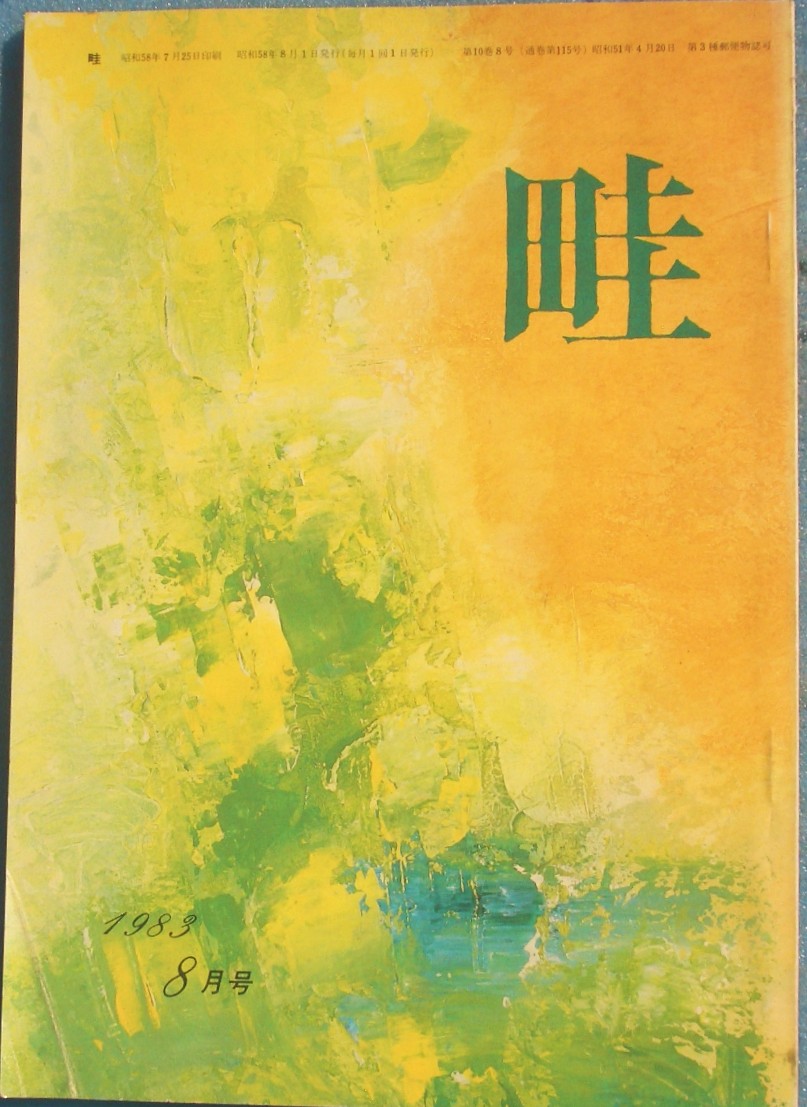 | 畦 10巻8号・通巻115号 1983年8月号 俳句雑誌 畦発行所 | A5判、84ページ、表紙角折、少汚 | 上田五千石、島村正、本宮鼎三ほか | 畦発行所 | 昭和58年 | \600 |