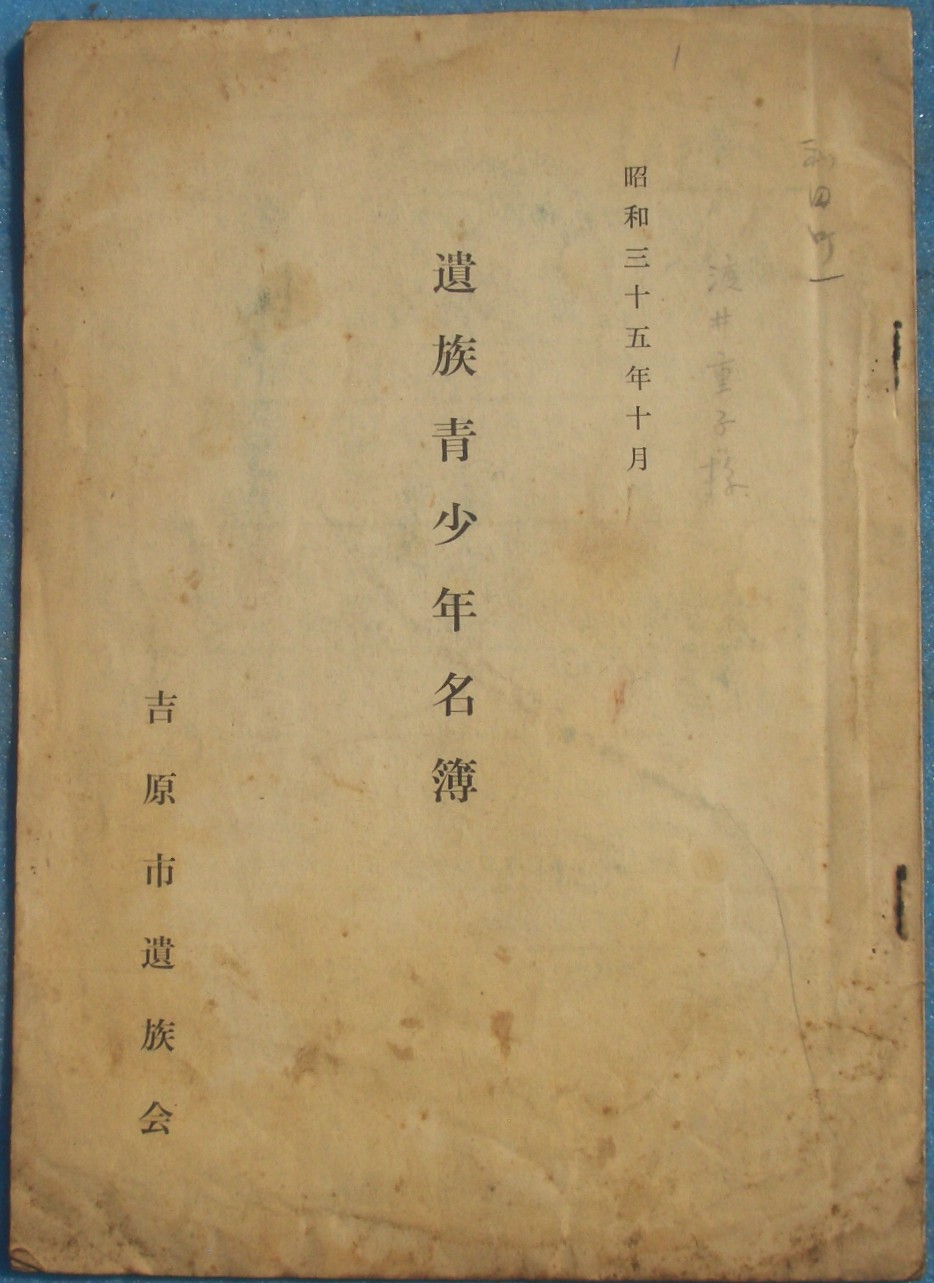 | 遺族青少年名簿 昭和35年10月 吉原市遺族会 (静岡県富士市) | B5判、11ページ、記名、蔵印、汚・錆、シワ | 吉原市遺族会 | 昭和35年 | \1,000 | |