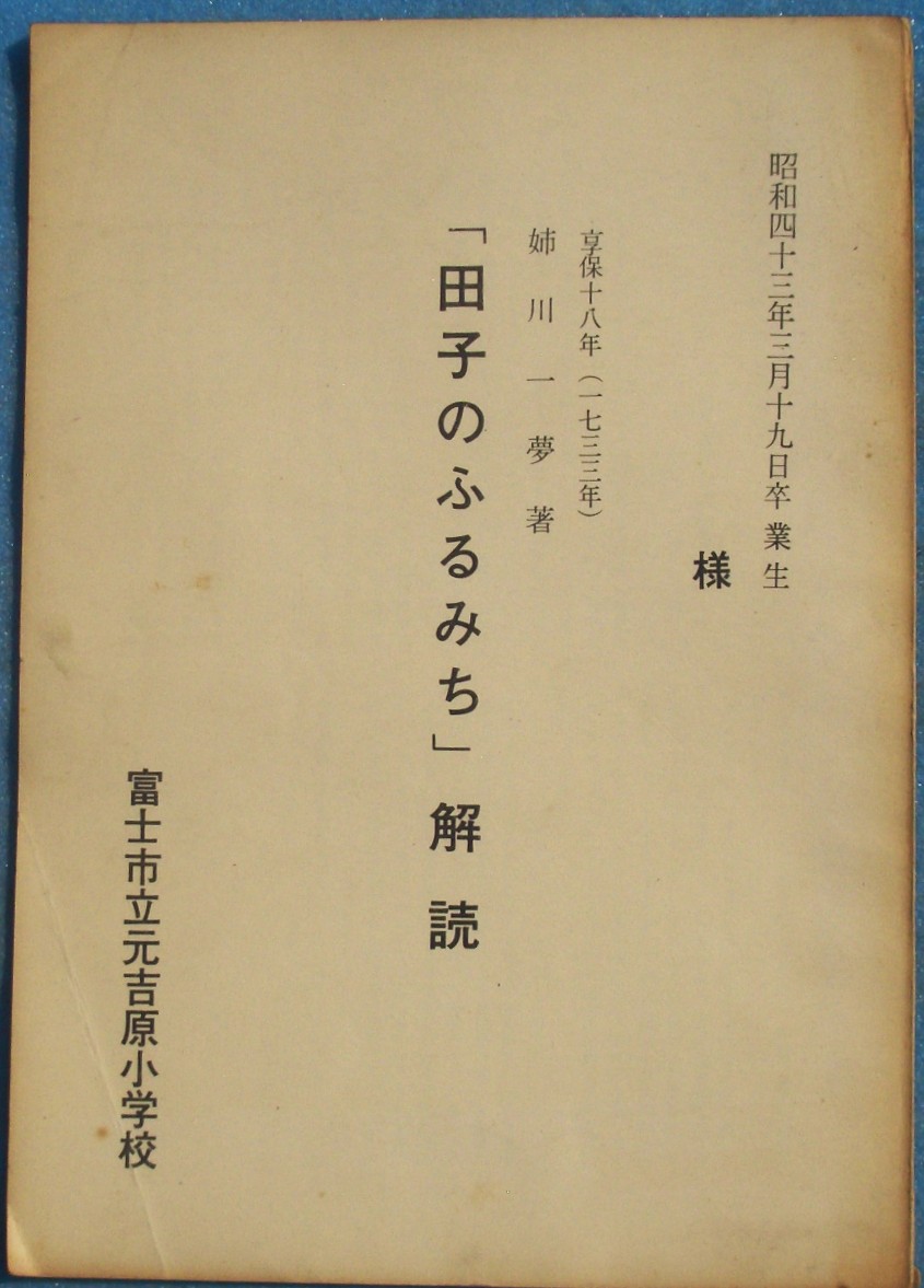 | 「田子のふるみち」解読 昭和43年・富士市立元吉原小学校卒業記念 | B5判、28ページ、背・小口ヤケ、表紙表紙少汚折 | 富士市立元吉原小学校 | 昭和43年 | \800 | |