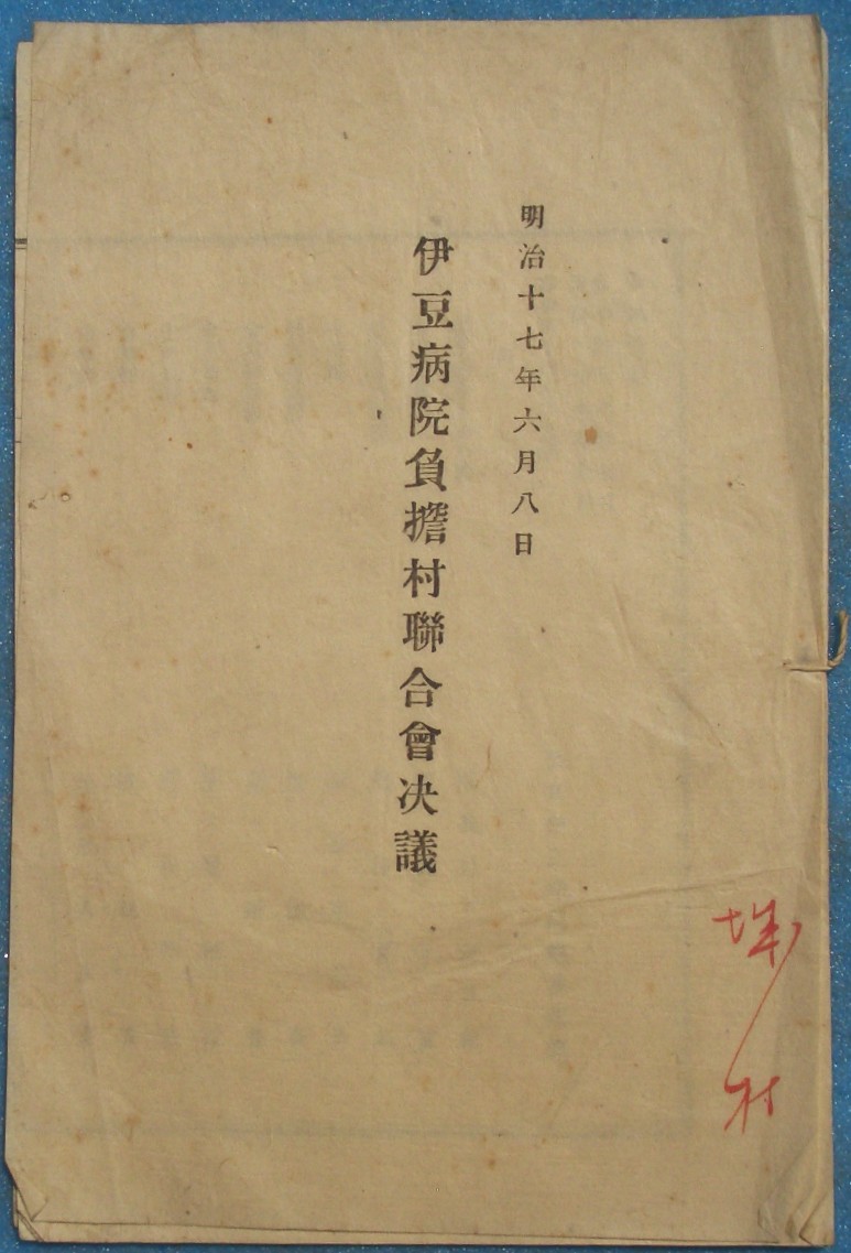 | 伊豆病院負擔村聯合會決議 明治17年6月8日 | A5判、六丁、紐綴、端痛 | 明治17年 | \1,500 | ||