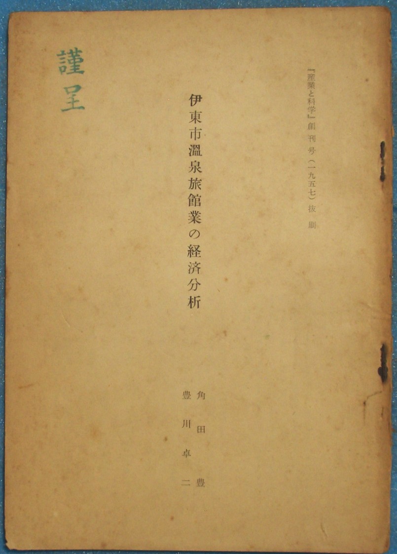 | 伊東市温泉旅館業の経済分析 「産業と科学」創刊号(1957)抜刷 | A5判、34ページ、錆シミ、ヤケ汚、端痛、謹呈印、小口ヤケ大 | 角田章、豊川卓二 | \400 | ||
