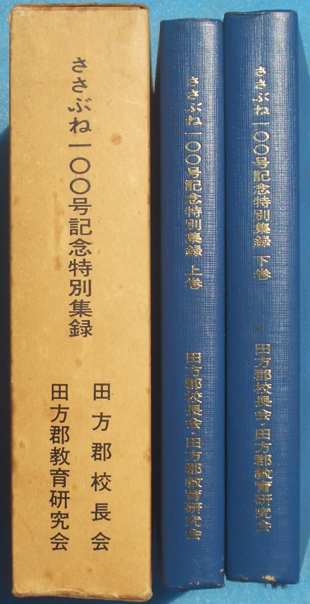 | ささぶね100号記念特別集録 上下2冊 田方郡校長会・田方郡教育研究会 (田方文園・小学生文集) | A5判、1函2冊、函汚痛、小口少ヤケ | 田方郡校長会・田方郡教育研究会 | 昭和60年 | \2,500 | |