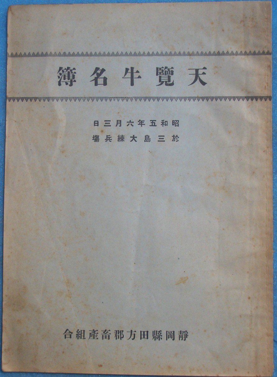 | 天覧牛名簿 昭和5年6月3日 於三島大練兵場 静岡県田方郡畜産組合 | B5判、20ページ、表裏表紙汚・痛 | 静岡県田方郡畜産組合 | 昭和5年 | \2,000 | |
