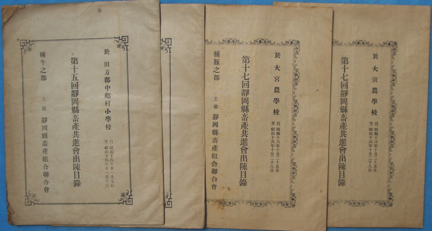 | 第15回静岡県畜産共進会出陳目録 種牛之部/第15回 役馬/第17回 種豚之部 三冊 | B5判、各薄冊、ヤケ・汚、端・角痛 | 於田方郡中郷村小学校・於大宮農学校 | 静岡県畜産組合連合会主催 | 昭和14・16年 | \3,000 |