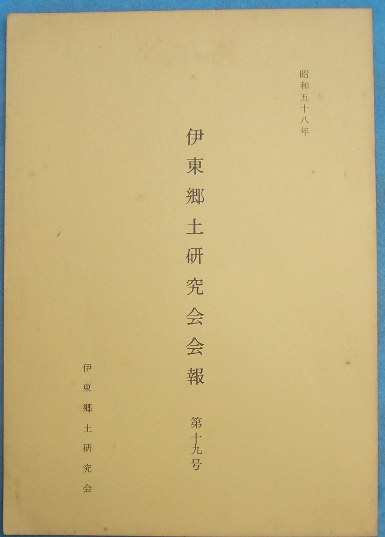 | 伊東郷土研究会会報 19号 (昭和58年) 静岡県 伊東郷土研究会 | B5判、40ページ、表裏表紙少汚 | 黒船屋とある郷土史座談会、宇佐美の冠婚葬祭(木部きぬの追想)、玖須美地名考、山境論御訴訟事、荻野家の謎をめぐって ほか | 伊東郷土研究会 | 昭和58年 | \700 |