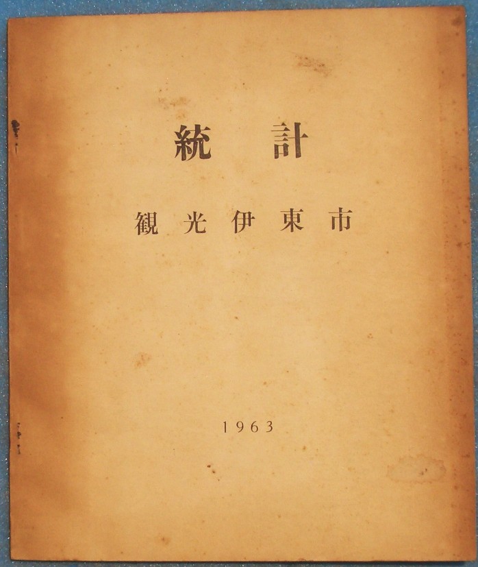 | 統計 観光伊東市 1963 (静岡県) 伊東市役所観光課 | B5枡形、43ページ、表裏表紙ヤケ汚 | 伊東市役所観光課 | 昭和38年 | \800 | |