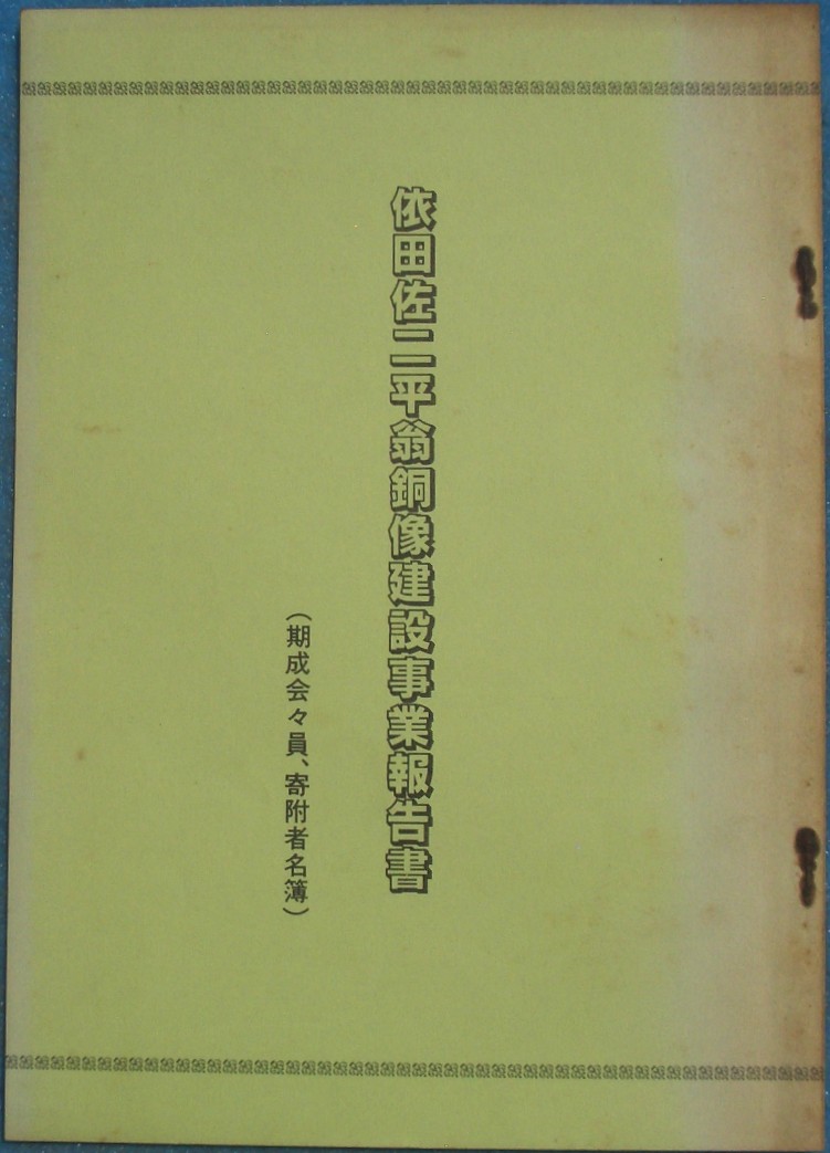 | 依田佐二平翁銅像建設事業報告書 (期成会々員・寄付者名簿) 静岡県賀茂郡松崎町 | B5判、21ページ、表紙ヤケ・汚・釘錆 | 売切 | |||