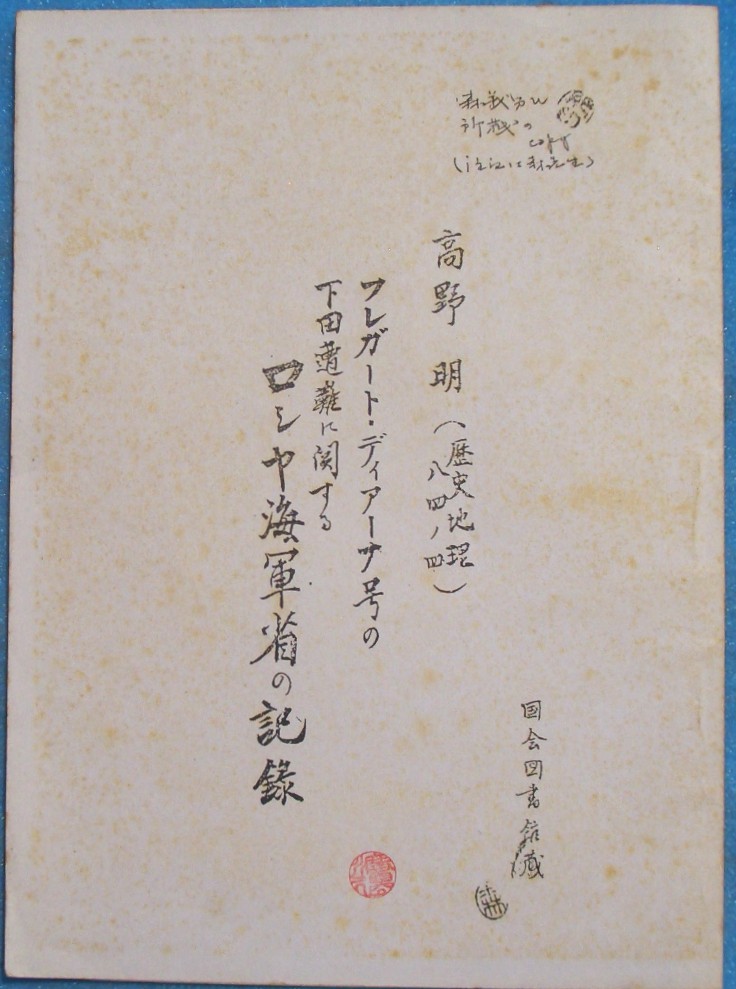 | フレガート・ディアーナ号の下田遭難に関する海軍省の記録 (複製) | B5判、複製、21ページ、表裏表紙汚、蔵印 | 高野明 | \600 | ||