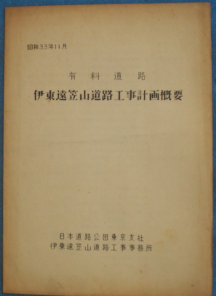 | 有料道路 伊東遠笠山道路工事計画概要 昭和33年11月 | B5判、2ページ(二つ折)、ヤケ・汚有 | 日本道路公団東京支社伊東遠笠山道路工事事務所 | 昭和33年 | 売切 | |