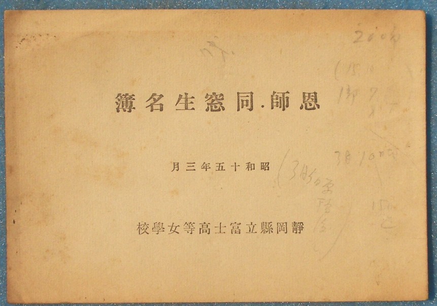恩師・同窓生名簿 昭和15年3月 静岡県立富士高等女学校 | 文庫判サイズ横本、薄冊・9ページ、ヤケ、表紙少書 | 静岡県立富士高等女学校 | 昭和15年 | \1,000 | |