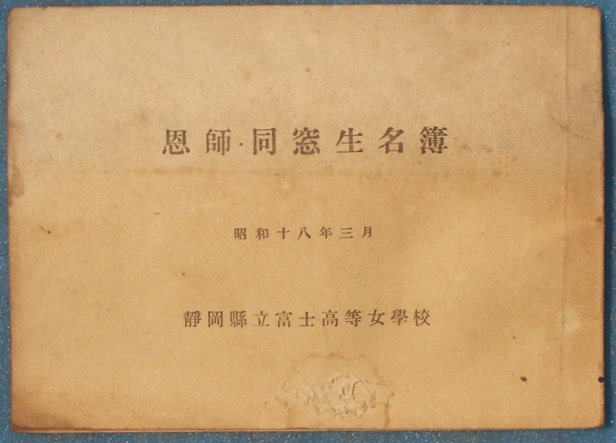 恩師・同窓生名簿 昭和18年3月 静岡県立富士高等女学校 | 文庫判サイズ横本、薄冊11ページ、ヤケ、表紙傷穴 | 静岡県立富士高等女学校 | 昭和18年 | \1,000 | |