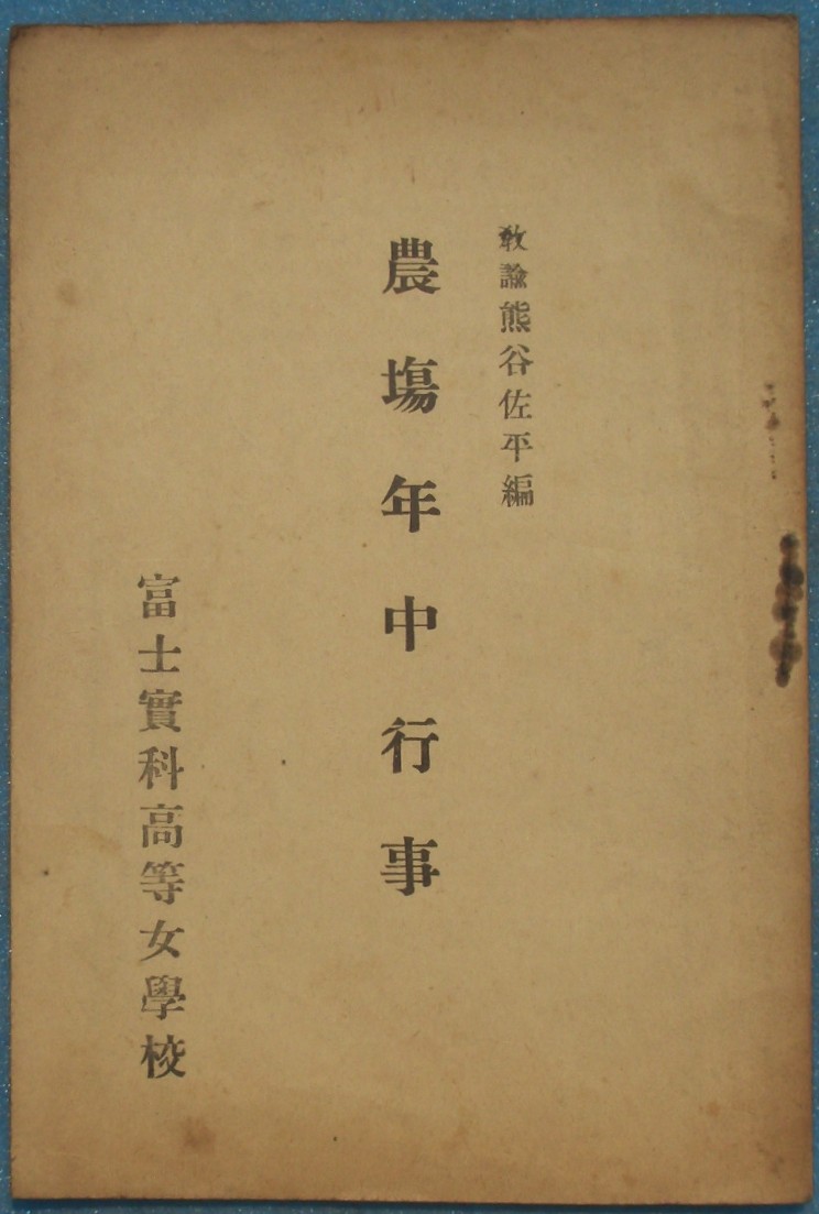 農場年中行事 富士実科高等女学校 (静岡県) | B6判、薄冊・14ページ、ヤケ、釘錆、記名 | 熊谷佐平編 | 静岡県・富士実科高等女学校 | 大正 | \1,000 |