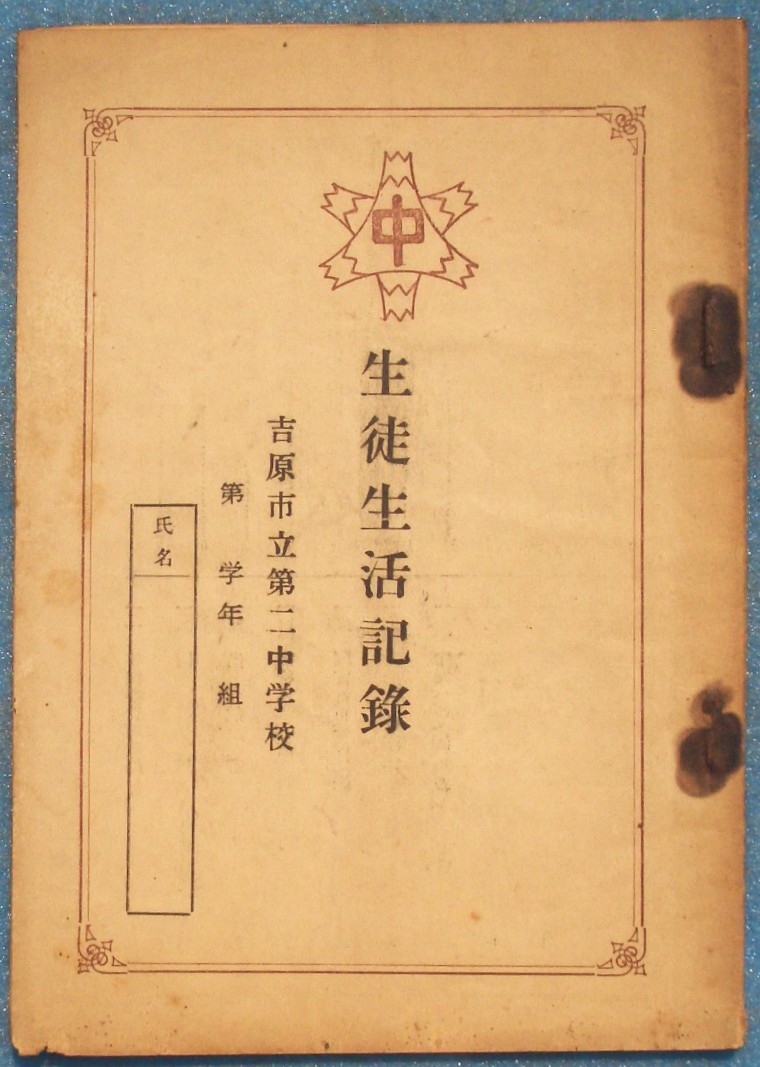 生徒生活記録 静岡県吉原市立第二中学校 | B6判、32ページ、校友会会則等、未記入、ヤケ・釘錆大、折 | 静岡県吉原市立第二中学校 | 昭和25年 | \1,000 | |