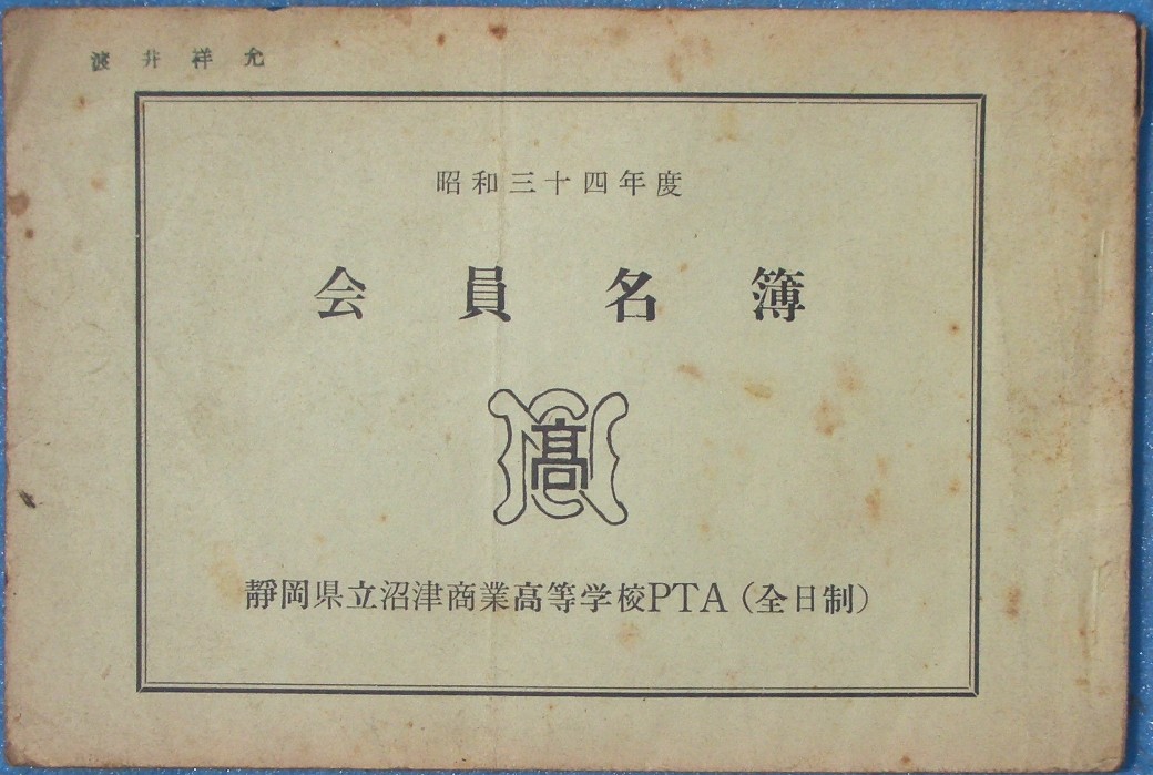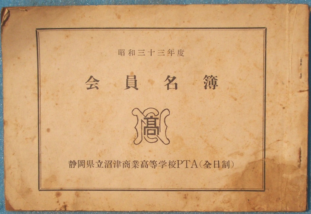 昭和33年度会員名簿 静岡県立沼津商業高等学校PTA(全日制) | B6判横本、58ページ、表紙シミ・汚・端痛、小口ヤケ大 | 静岡県立沼津商業高等学校PTA | 昭和33年度 | \1,000 | |