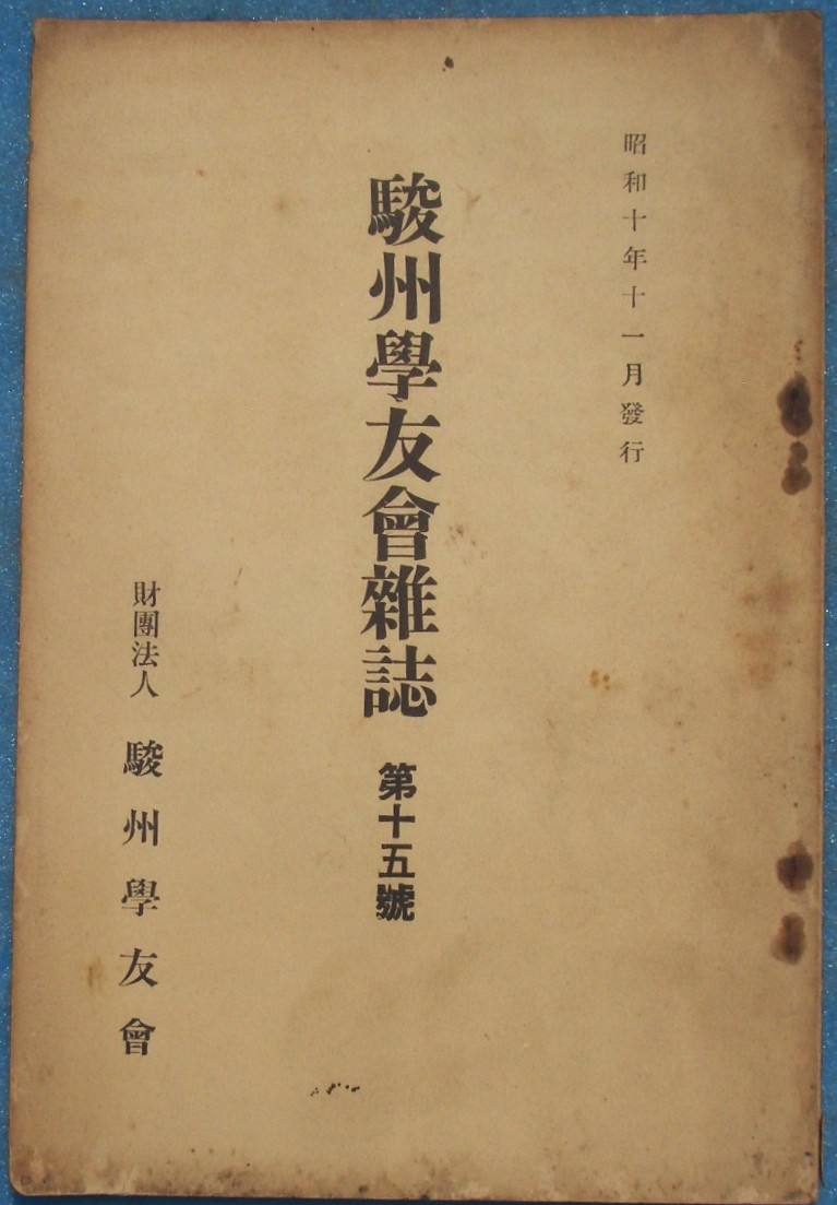 駿州学友会雑誌 15号 (昭和10年11月号) | A5判、背痛、ヤケ汚、小口ヤケ、釘錆 | 会員抄録・会員名簿等 | 駿州学友会事務所 | 昭和10年 | \800 |