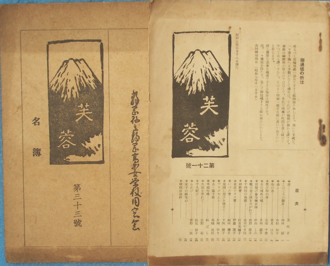 芙蓉 21・33号 二冊 静岡県立静岡高等女学校同窓会 | A5判、40・88ページ、33号は同窓会名簿、背痛、端ヤケ汚 | 静岡県立静岡高等女学校同窓会 | 昭和7・18年 | \1,800 | |