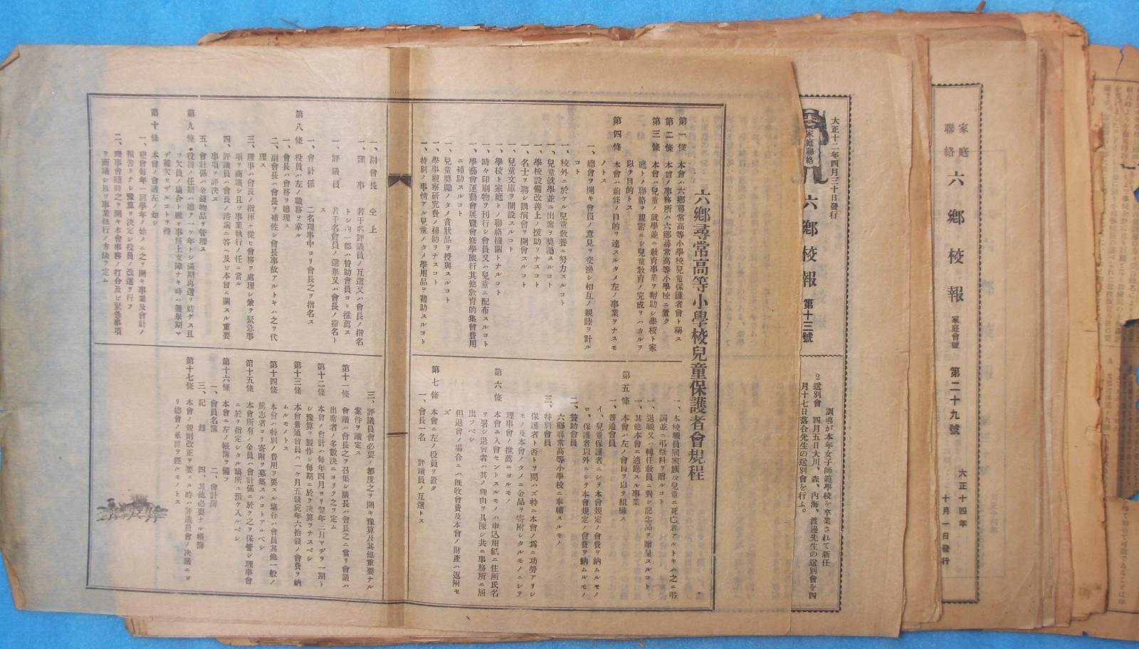 家庭連絡 六郷校報 大正12年〜昭和9年 46枚 六郷尋常高等小学校 (静岡県菊川市) | B4判、薄紙、端痛破有 | 規程、13〜16、18〜44、御大典記念号、47〜50、52、53、56、65,66、69、73、74、77号の46枚 | 六郷尋常高等小学校(静岡県) | 大正12年4月30日〜昭和9年3月28日号 | \10,000 |