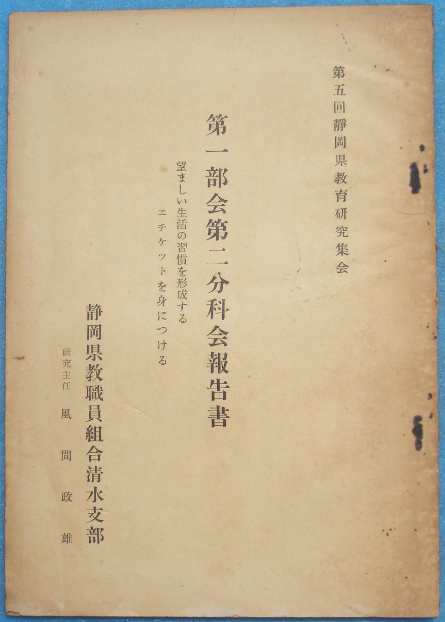 第一部会第二分科会報告書 望ましい生活の習慣を形成するエチケットを身につける | 第五回静岡県教育研究集会、B5判、35ページ、表紙汚端痛、小口ヤケ大 | 静岡県教職員組合清水支部・風間政雄 | \800 | ||