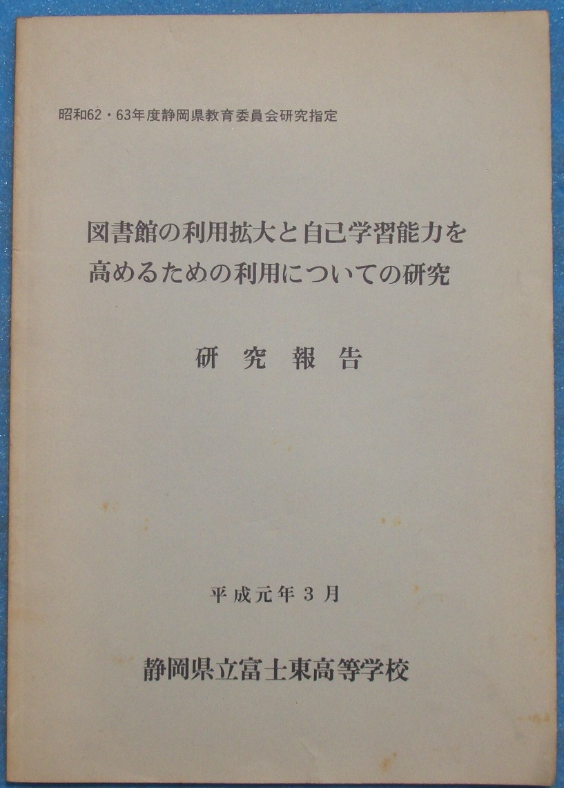図書館の利用拡大と自己学習能力を高めるための利用についての研究 研究報告 | 昭和62・63年度静岡県教育委員会研究指定、B5判、63ページ、端少痛 | 静岡県立富士東高等学校 | 平成元年3月 | \800 | |