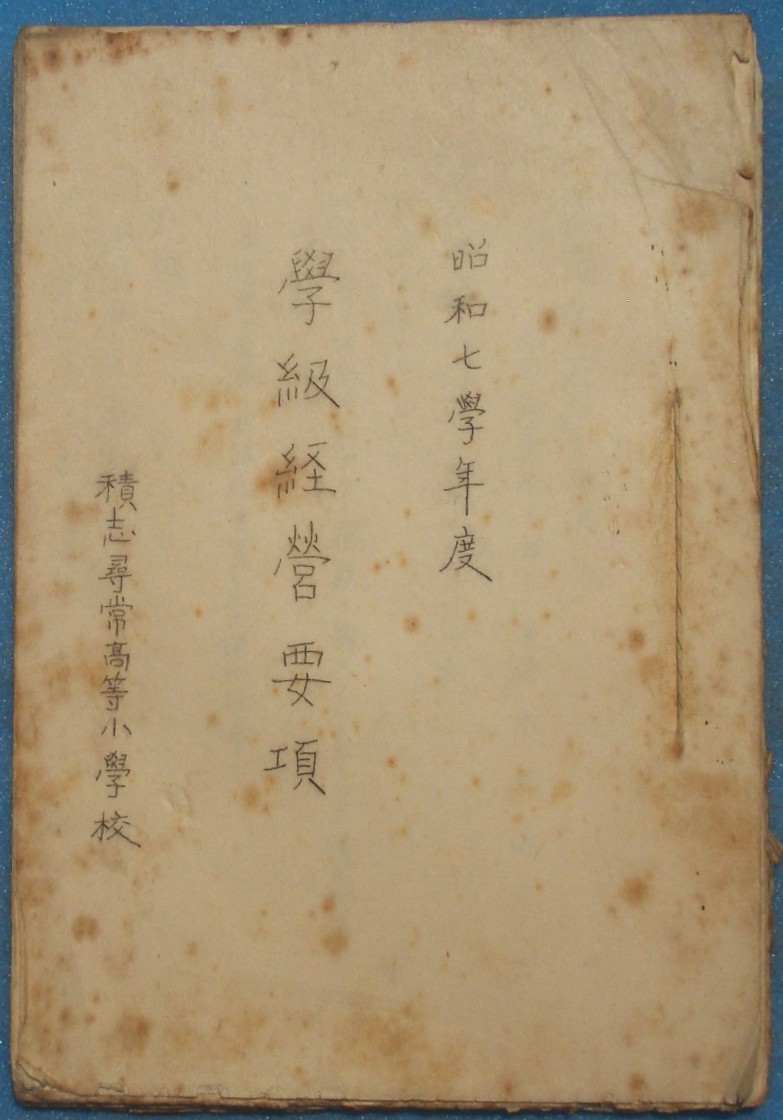 学級経営要項 昭和7学年度 積志尋常高等小学校 (静岡県浜松市) 孔版 | B5判、孔版、紐綴、71ページ、表裏表紙汚・端痛 | 静岡県浜松市・積志尋常高等小学校 | 昭和7年度 | \1,000 | |