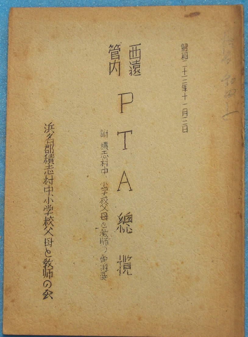 西遠管内PTA総覧 附・積志中・小学校父母と教師の会概要 孔版 | B5判、孔版、21ページ、少書、汚、小口ヤケ | 浜名郡積志村中小学校父母と教師の会 | 昭和23年11月 | \1,000 | |