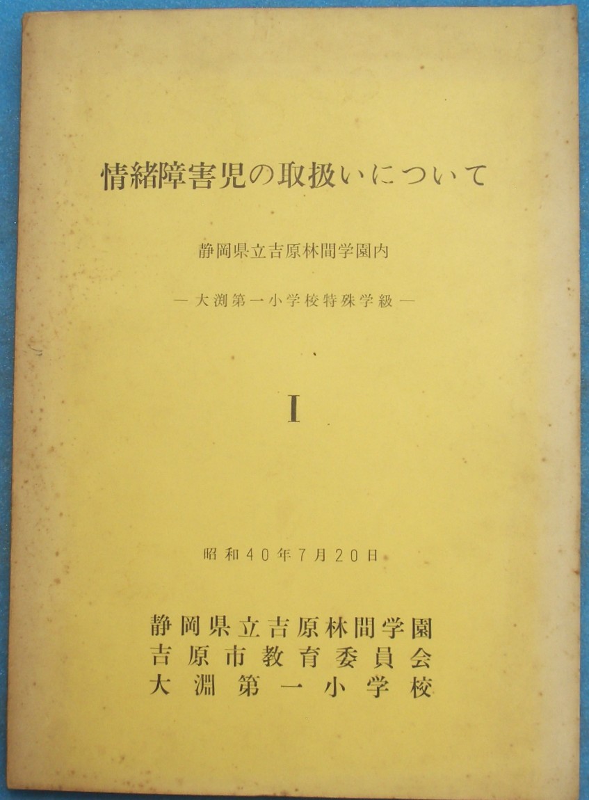 情緒障害児の取扱いについて 1 静岡県立吉原林間学園内・大渕第一小学校特殊学級 | B5判、173ページ、表紙端ヤケ汚、背・小口ヤケ大 | 静岡県立吉原林間学園・吉原市教育委員会・大淵第一小学校 | 昭和40年7月20日 | \2,000 | |