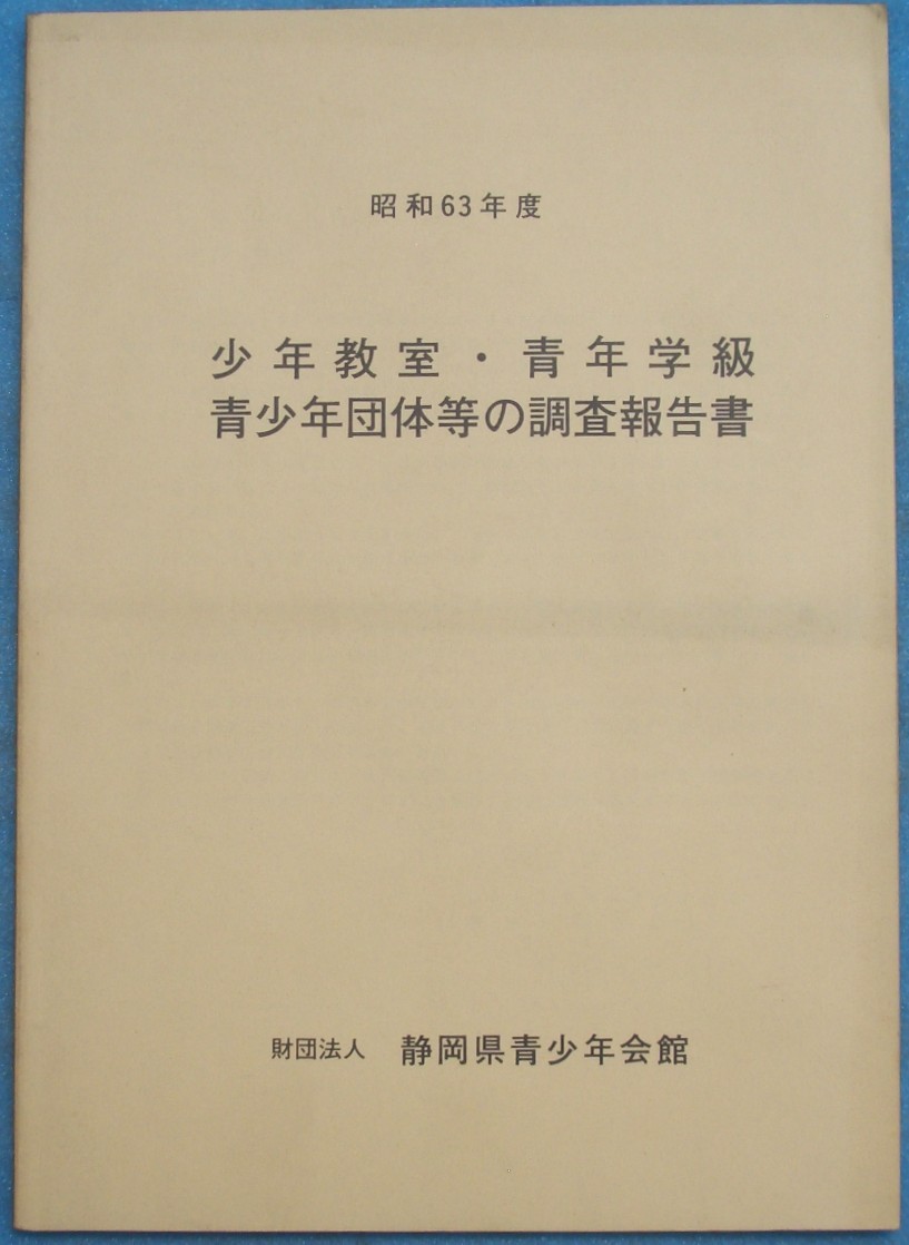 少年教室・青年学級・青少年団体等の調査報告書 昭和63年度 静岡県青少年会館 | B5判、88ページ、少汚、小口少ヤケ | 静岡県青少年会館 | 昭和63年度 | \700 | |