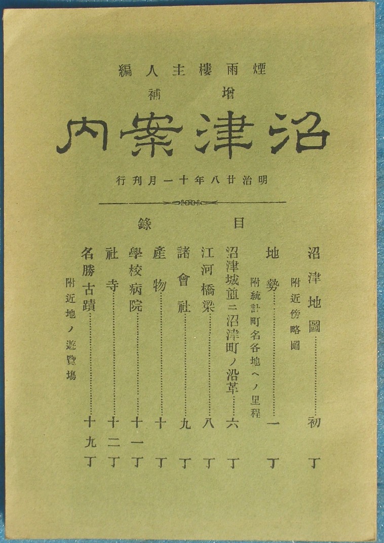 | 増補 沼津案内 煙雨楼主人編 復刻版 | B6判、36ページ、綴込地図入、背・小口少ヤケ、明治28年の復刻版 | 沼津市明治史料館 | 昭和59年 | \1,000 | |