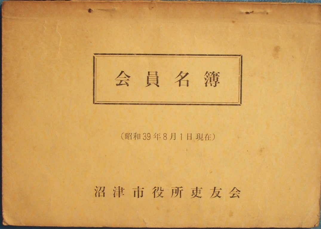 | 沼津市役所吏友会 会員名簿 昭和39年8月1日現在 | B6判、90ページ、横本、端痛、背・小口ヤケ大 | 静岡県沼津市 | 昭和39年 | \1,000 | |
