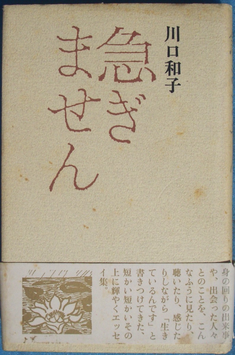 | 急ぎません 短文集 | B6変形判ハードカバー、カバー背少ヤケ・汚、帯少破、小口汚 | 川口和子(静岡県沼津市) | 書肆季節社 | 1989年 | \600 |
