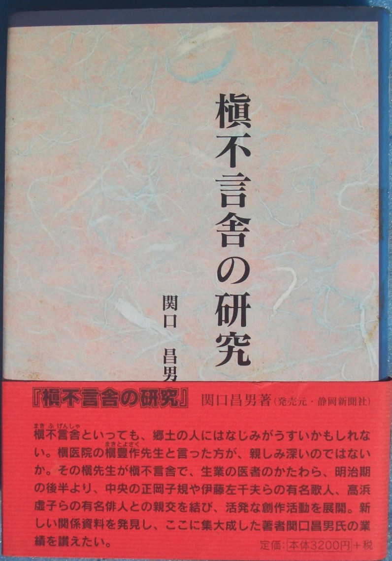 | 槇不言舎の研究 (静岡県沼津市・医師・歌人・俳人) | B6判ハードカバー、カバー背少ヤケ、帯、小口少ヤケ | 関口昌男 | 静岡新聞社 | 平成13年 | \1,200 |