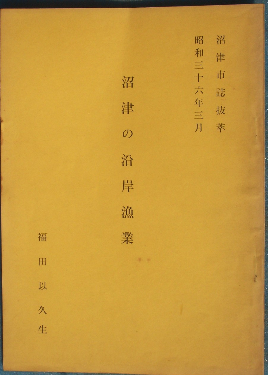| 沼津の沿岸漁業 沼津市誌抜萃 昭和36年3月 | A5判、34ページ、表紙端少汚 | 福田以久生 | 昭和36年 | \400 | |