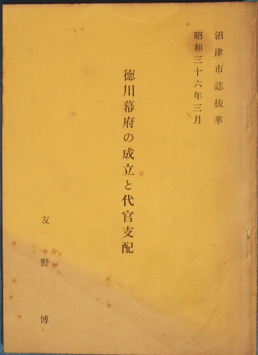 | 徳川幕府の成立と代官支配 沼津市誌抜萃 昭和36年3月 | A5判、42ページ、表紙ヤケ・汚 | 友野博 | 昭和36年 | \400 | |
