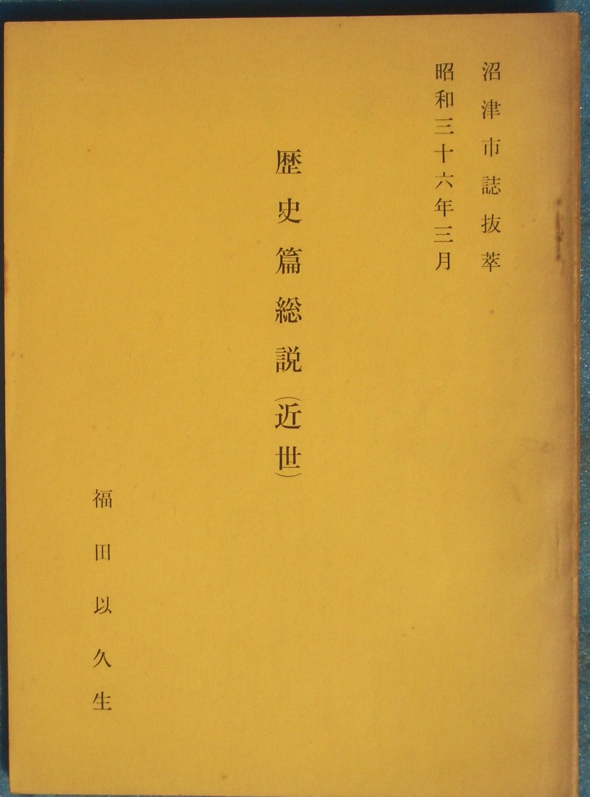 | 歴史篇総説(近世) 沼津市誌抜萃 昭和36年3月 | A5判、85ページ、背・小口ヤケ | 福田以久生 | 昭和36年 | \500 | |